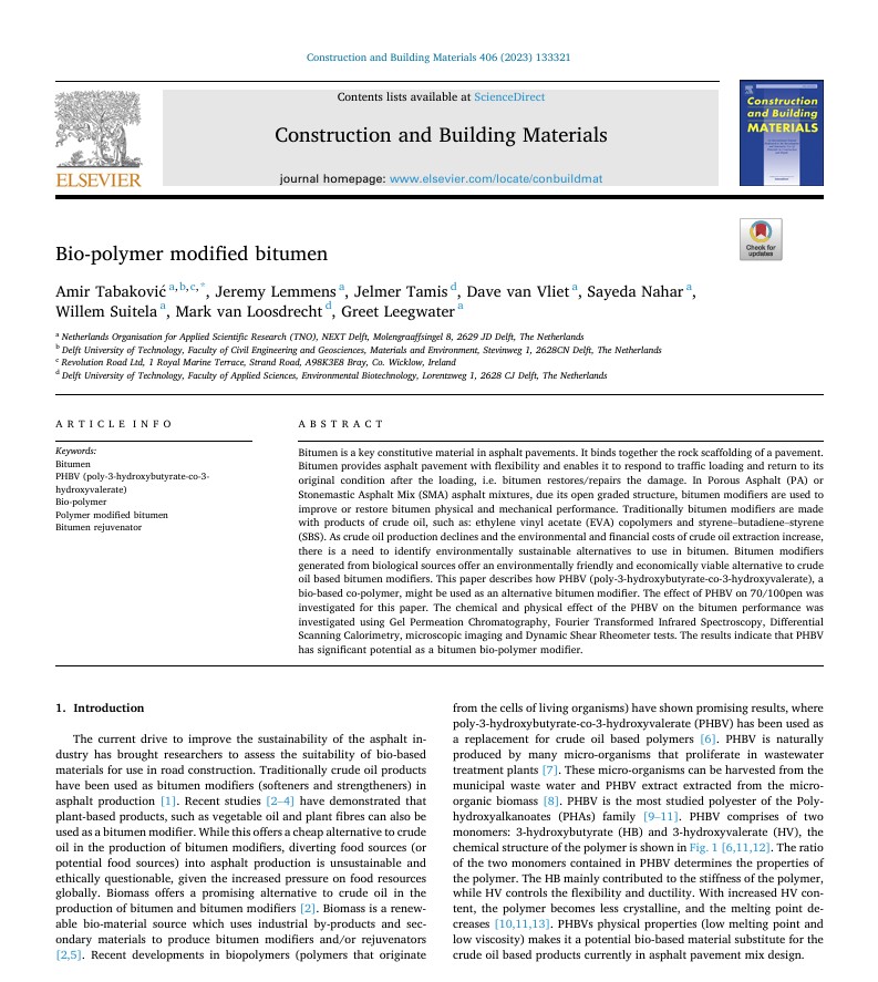 Tabaković, A., et al. 2023, “Bio-Polymer Modified Bitumen”, Construction and Building Materials